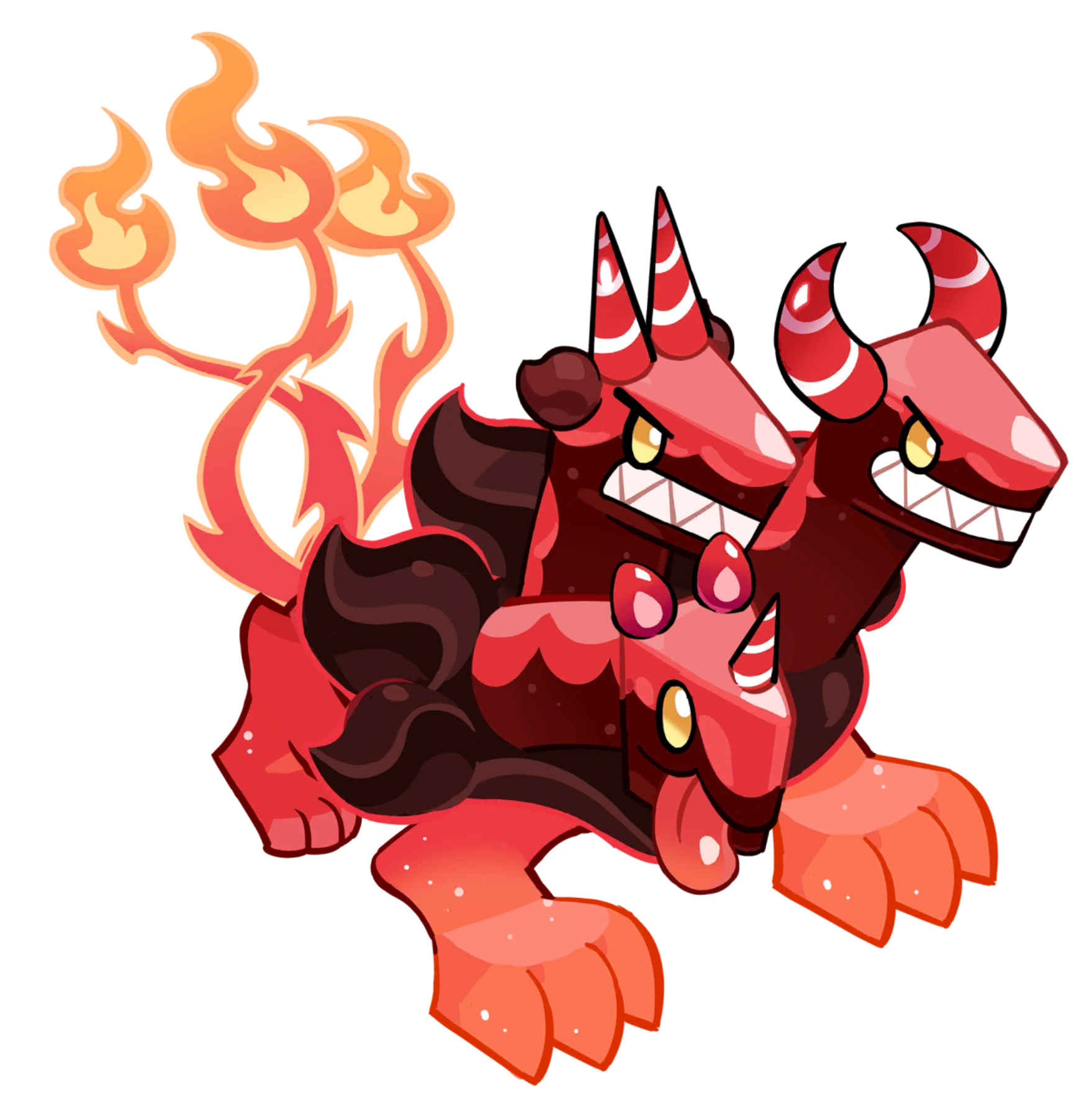 Cakeberus is a three-headed, hound-like beast made out of cake. The monster also sports three thin, fiery tails. The first head has two strawberry ears and a small red horn with white stripes while also looking noticeably less aggressive than the other two heads, due to its wide eyes and and hanging tongue. The second head has two straight red and white horns between two dollops of brown frosting in place of ears, its sharp teeth bared and eyes more narrowed than the first head. The third head has two curved horns in place of ears and wears a similar facial expression to the second, though looks slightly more amused and wears a bit of a grin.