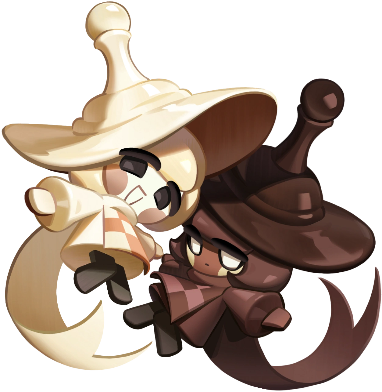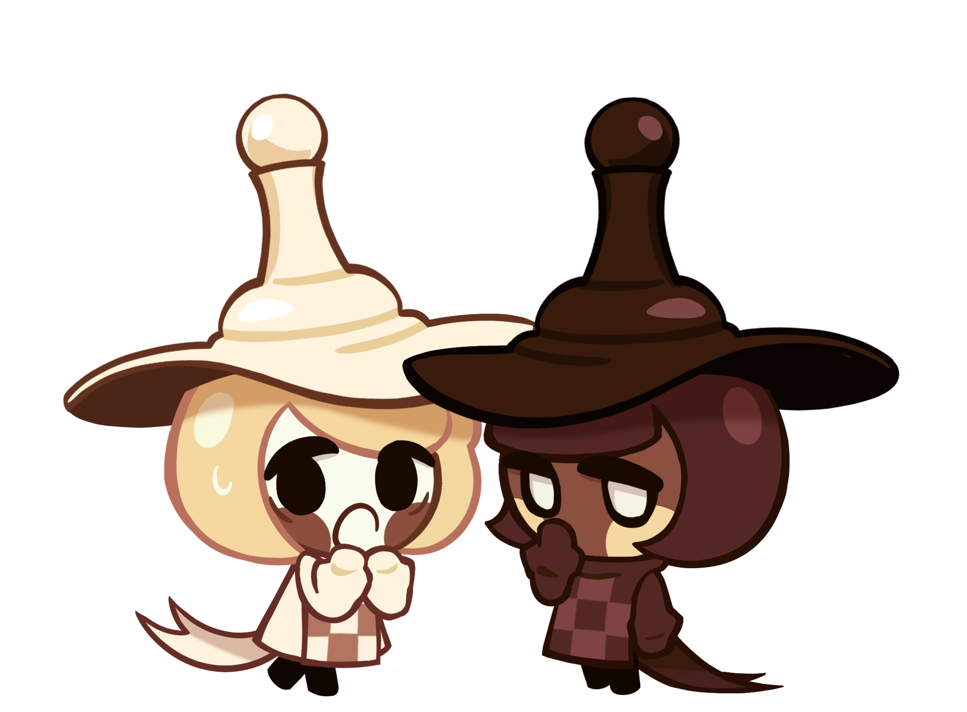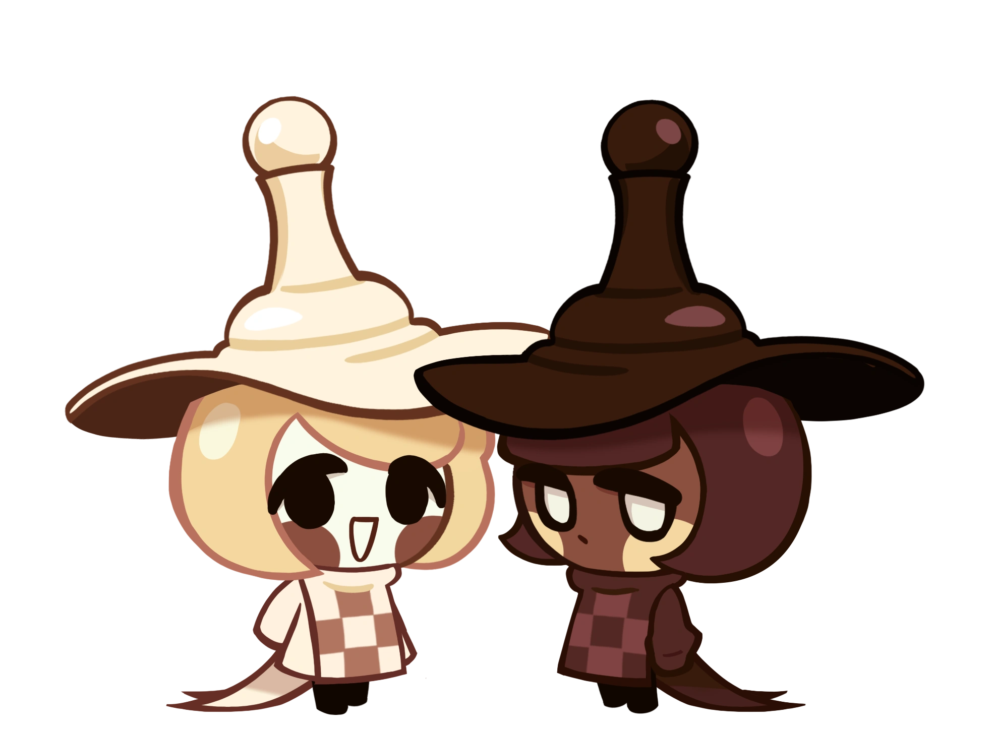 The twins wear hats tall enough to double their height, each resembling pawn chess pieces with wide brims and displaying their thematic color in chocolatey tones. Their attire is simple and largely monochromatic, each wearing a turtlenecked smock with open sides. These aprons are emblazoned with a three-by-three checkerboard pattern and trail along the ground in one long, forked coattail. Underneath, they each wear a simple sweater, oversized with sleeves long enough to cover their hands. On their legs are featureless black leggings with no discernible shoes. The twins' clothing are identical other than being dyed in each Cookie's matching color: Pawn White Cookie dresses in cream with a pale clay checkerboard emblem while Pawn Black Cookie wears espresso brown with a cordovan checkerboard.