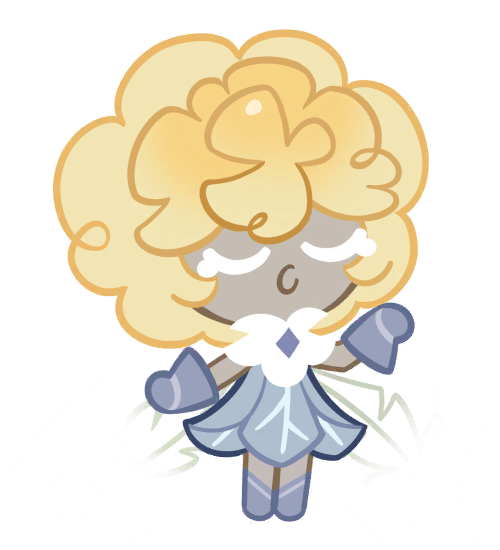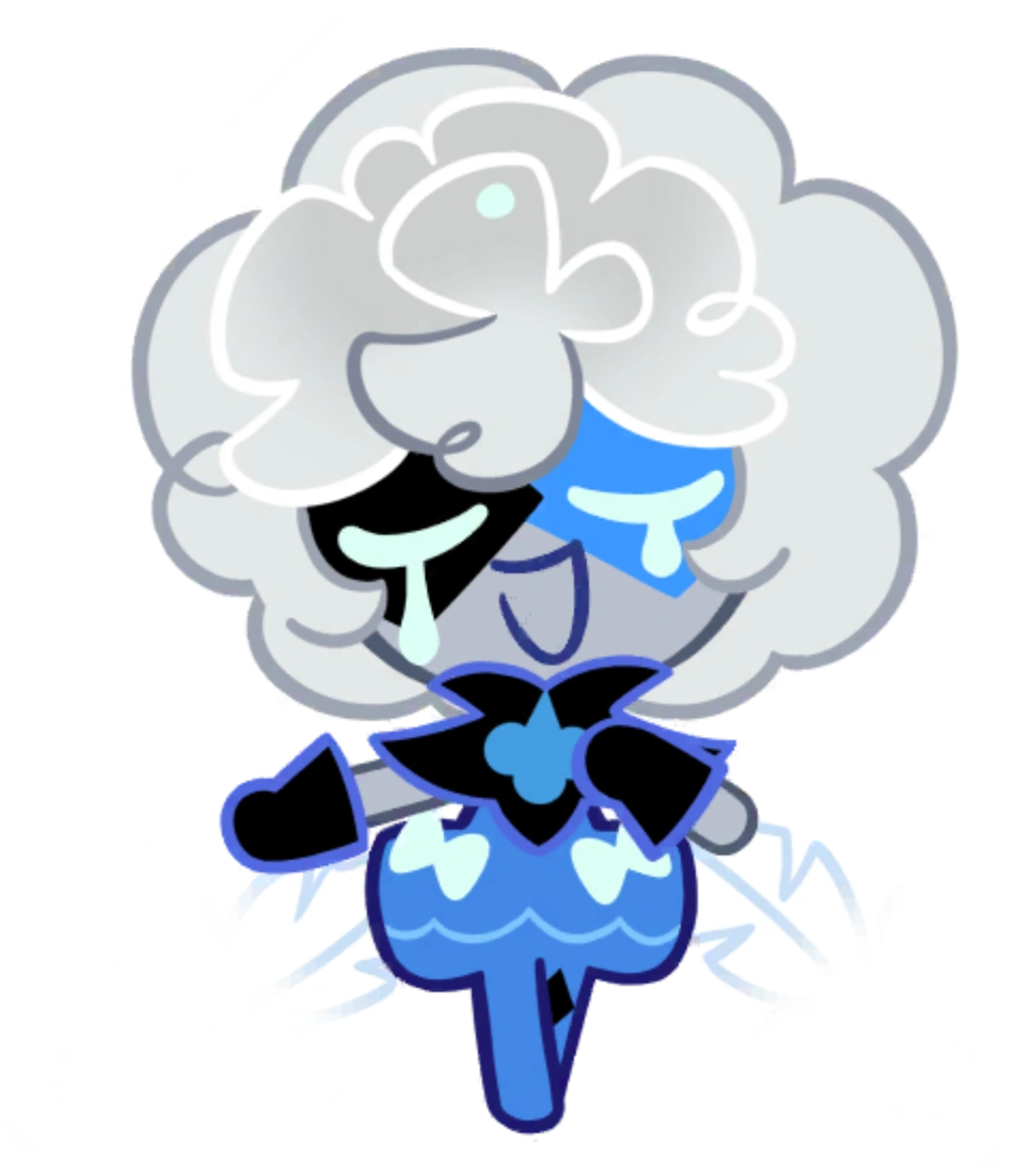 Faerie Cookie 1 has an extremely pale, grayish blue dough color. Their eyes are always closed and their eyelashes resemble streaming tears. They wear a black and blue mask that covers their eyes. They have a collar that resembles a jesters hat in black and it has a blue shape heavily resembling Shadow Milk Cookie’s soul jam in the middle of it. They wear a vibrant blue bubble skirt with light blue bows on either side of it. Their tights are the same color as the skirt and have a small black diamond on one side. They have short black gloves on. Their wings are an extremely light blue-gray and resemble the leaves of dandelions. Faerie Cookie 1’s hair is a grayish white, is curly, and resembles a dandelion in its later stages of life.