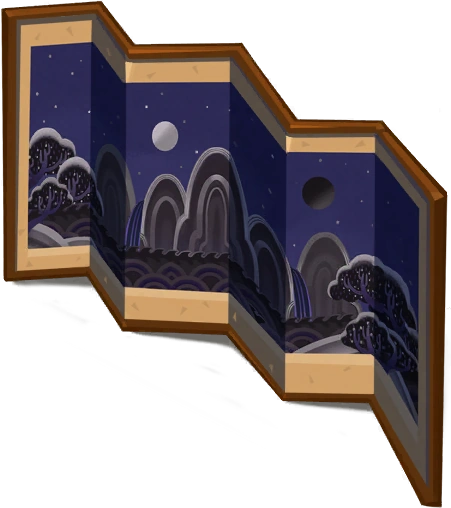 A breathtaking scenery with a white sun, black moon, and a tall peak blocking the Licorice Sea is depicted on the folding screen that decorates |