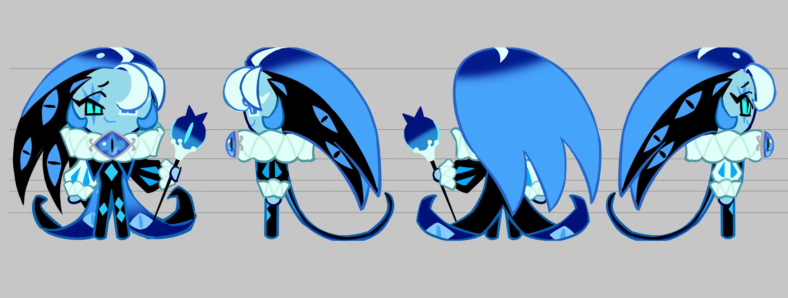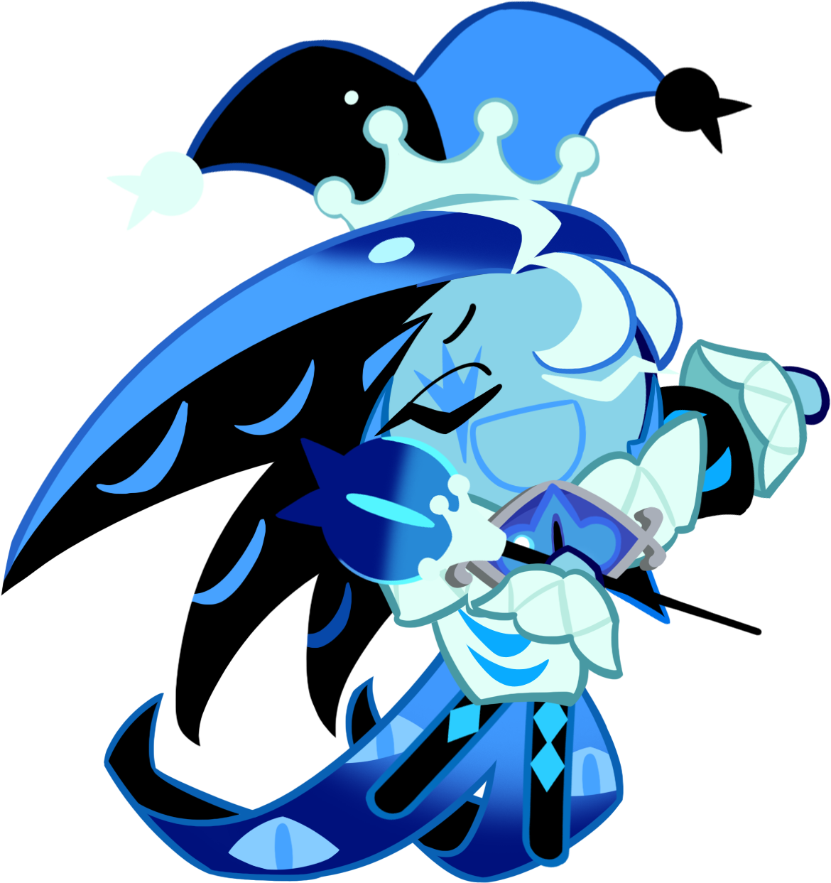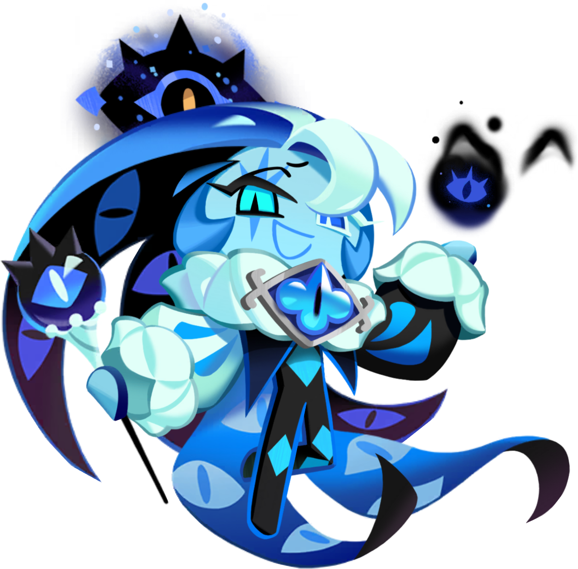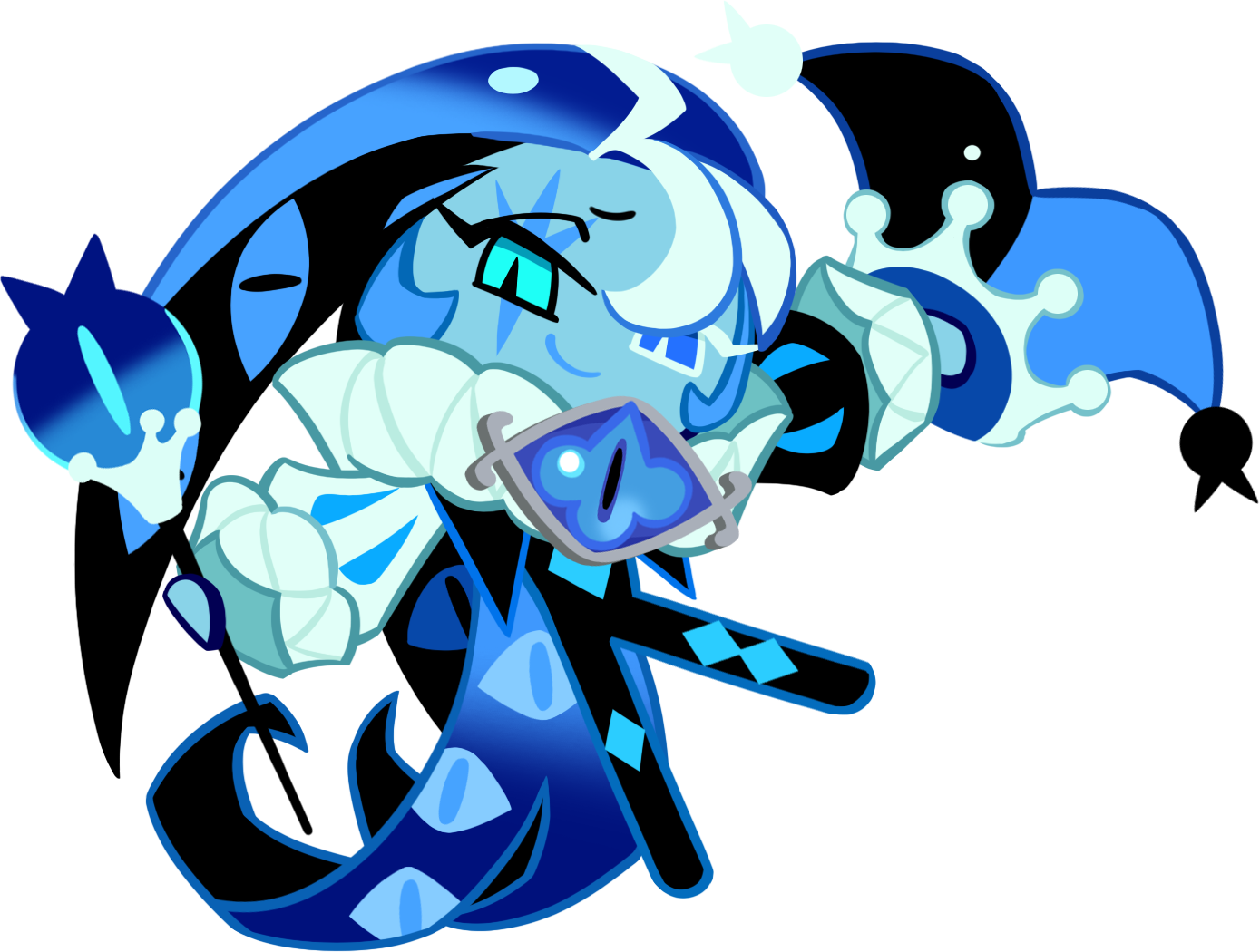 Shadow Milk Cookie wears an obsidian harlequin unitard with turquoise diamond appliques. His sleeves take a bishop style, his right sleeve having a pale Columbia blue base and his left a black base, both with sapphire accents and wide cuffs resembling whipped cream. The jester wears a ruff collar from which hang curling coattails with a ghostly blue lining and a black outside. Upon its lining are more gazing eyes. He wears his eye-like Soul Jam of Deceit as a brooch on his collar in the same place that Pure Vanilla Cookie wears his own Soul Jam. Shadow Milk Cookie also holds a jester hat split into black and cobalt halves, having a milk-splash crown about its rim and blueberry-shaped pompoms at its extending tassels. He holds a thin black staff with a blueberry eyeball handle and another milk design at its neck, its eye-like design being a direct reflection of