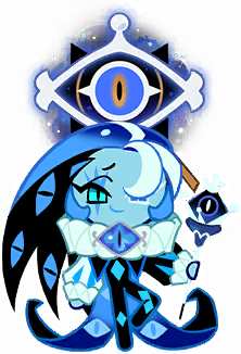 Shadow Milk Cookie is a spindly, average height Cookie with powder blue dough and two differently colored eyes: one cyan right eye with a black slit pupil and black eyelashes, and one cerulean left eye with a white slit pupil and white eyelashes. His mouth is sapphire blue and sly, having teeth which change between straight and sharp depending on his emotions. About his right eye is a pale blue, claw-shaped marking. He has white locks of hair near his face—two that fall against his forehead and one slicked back—azure curled sidelocks, and glossy, sharp, long hair in a dual-toned shadow and lapis style that resembles the extents of a jester's hat. Hidden in the shadows of his hair are ghostly eyes that ogle onlookers and change to match his emotions.