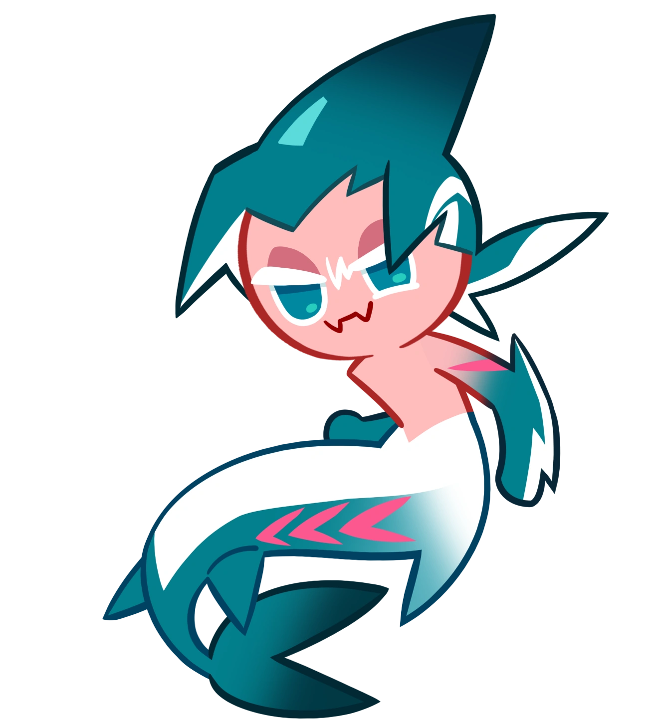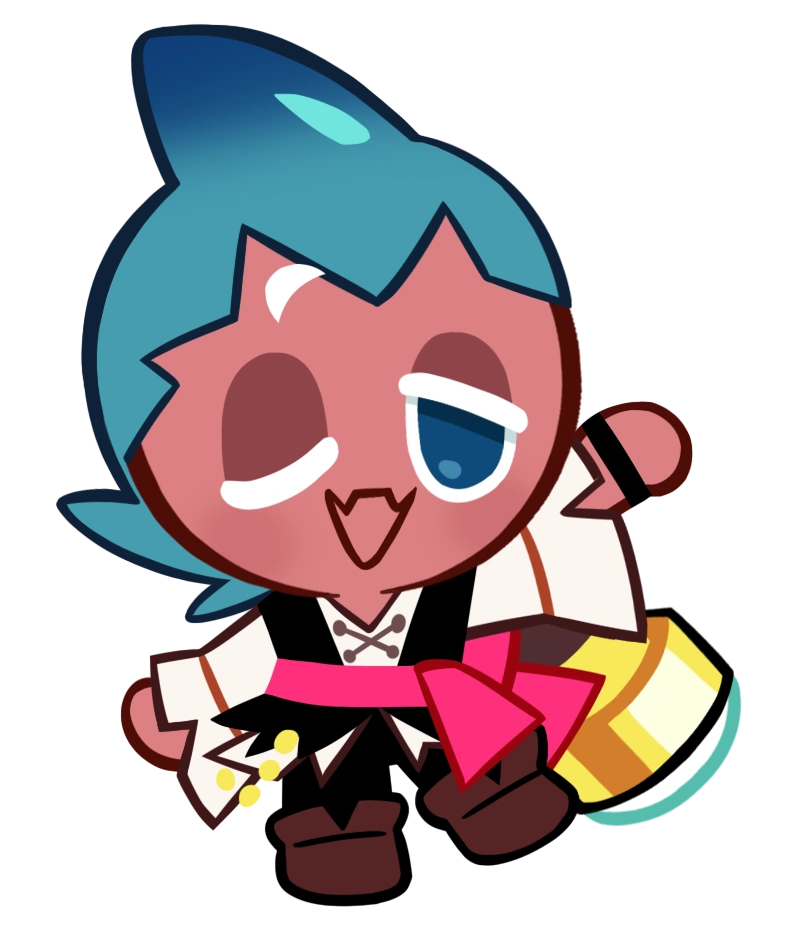 Sorbet Shark Cookie is a friendly, curious, and rambunctious shark mer-Cookie who dreams of going on grand adventures with pirates. Being able to transform between their full fishy form and a fun-sized land form, they spend their days swimming the seas in search of adventure and unintelligibly babbling bubble-speak on land.