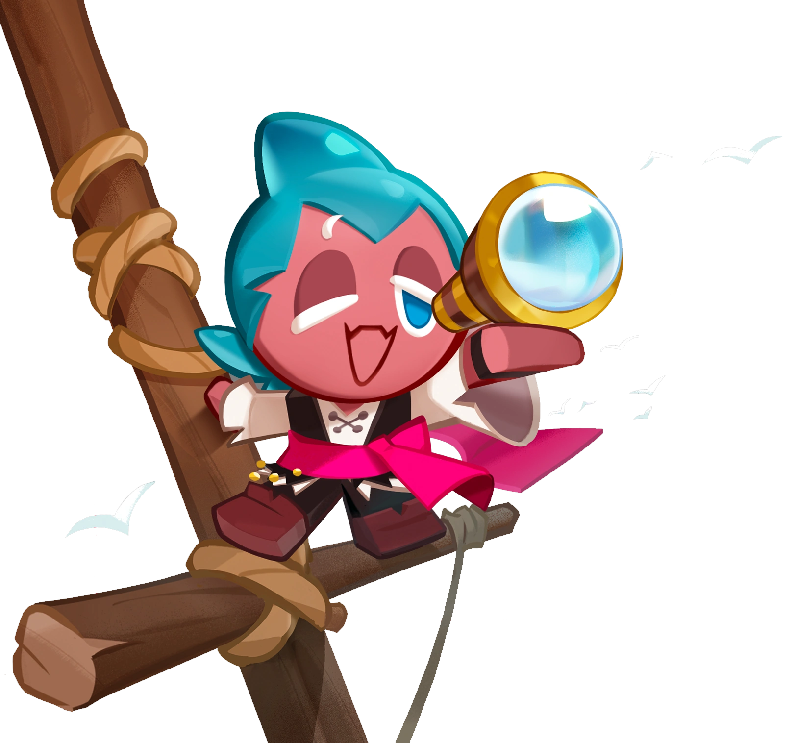They sport plain brown cavalier boots and simple black pants, along with a bell-sleeved white lace-up shirt, under a worn black vest. Some other accessories they don are the fuchsia bandanna tied around their waist, a black band on their left hand, a small golden chain on their right hip, and a large spyglass with golden accents. Their smooth "hair" is muted cyan with a dull blue ombré. Their attire resembles that of a pirate.