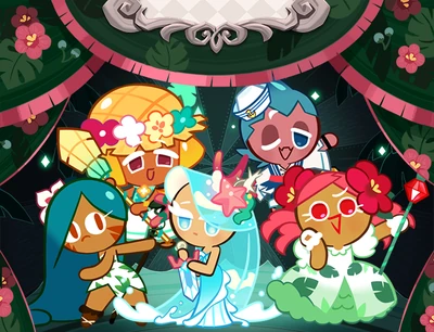Sea Fairy Cookie! Sea Fairy Cookie slowly raised her head to gaze upon the sky. Her blue hair cascaded down like a waterfall, capturing the glistening moonlight. Perhaps that was why she appeared- to marvel at the moon that seemed to glow ever so white today. Her coral, her iridescent seashells, the crystal conch, and the starfish adorning Sea Fairy Cookie's attire glistened in the moonlight. The Cookies stood still before the enchanting beauty of the scene.